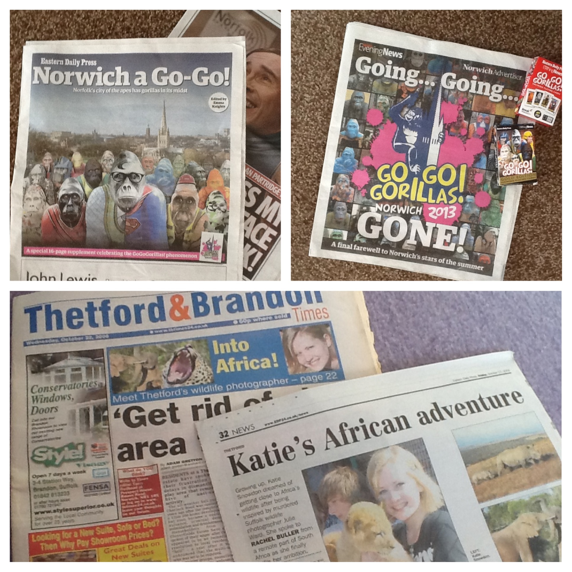 There have been so many Go Go Gorilla-related goings on over the latter half of the summer, that it’s been hard keeping track – especially as I left Norfolk in August to take on a six-month contract in London, working for Clipbank, Channel 4 Learning. Despite being out of town, I’ve been keeping touch with the initiative via local newspapers (online and having them sent to me). I’ve always found that our local papers in Norfolk are very supportive of charity work – which is a particular pleasure when it involves the Born Free Foundation, as I found out first hand when I volunteered with the charity in South Africa.