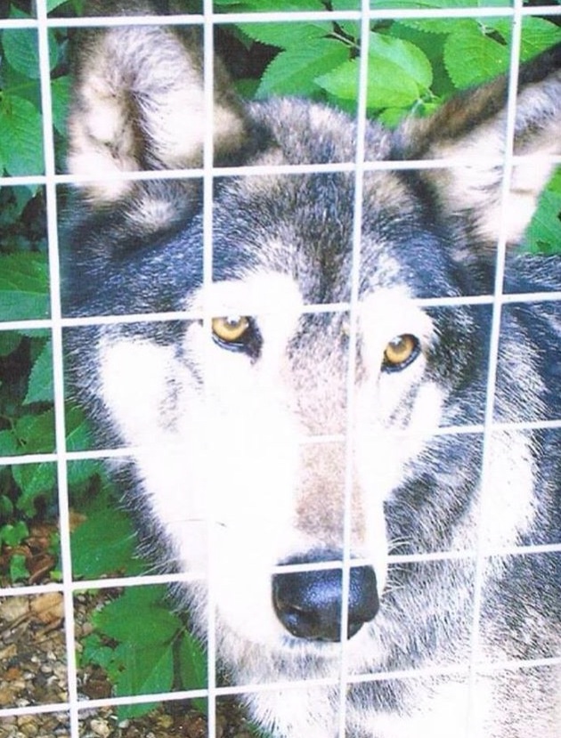 Bright green eyes stare out from a neatly tangled criss-cross of metal. Green metal. Green like grass, leaves, trees.
